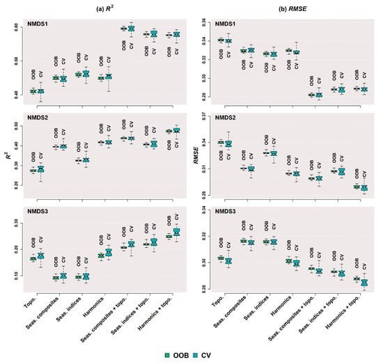 For the RF results of continuous NMDS ordination scores, results were less decisive, with CV scores quite similar among the datasets for three possible reasons. First, although OOB and CV scores of accuracy and error in terms of R2 and RMSE were also similar among the feature sets, CV assessments demonstrated a greater range in variability as might be expected for this agreement approach (Figure 6). Second, a trend towards decreasing accuracy with each subsequent dimension in the ordination largely reflected the total volume of floristic information transferred to each subordinate axis as part of the NMDS procedure of rotating the best solution to orthogonal gradients of maximum floristic variation. Finally, the variation in agreement between feature sets and combinations largely reflected the orthogonal nature of the different ecological gradients among each axis and the strength of each feature set and pairing in capturing this information.