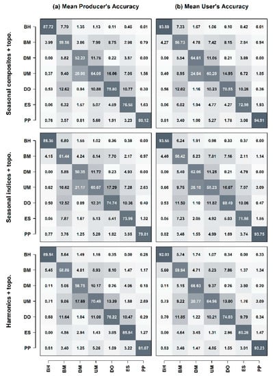 Mean producer’s (a) and user’s (b) accuracy for the seven forest types by three feature set combinations according to agreement between mapped labels and reference data by Random Forests on withheld test samples as part of the independent cross-validation agreement assessment. Heat maps are used to display confusion matrices, in which darker colors correspond to higher scores. Legend: BH = floodplain hardwoods/Bottomlands hydric; BM = bottomlands mixed hardwoods; DM = dry-mesic mixed mesophytic hardwoods; UM = upland mesophytic hardwoods; DO = dry-oak dominated hardwoods; ES = early-successional; and PP = pine plantations/mixed pine.