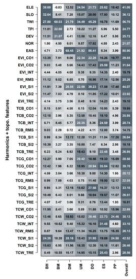 Mean feature importance values, including overall and class-level importance, of the harmonics + topographic feature set pairing by Random Forests (RF) classification models. Importance values display the % decrease in mean accuracy on permuting a given feature during predictions onto the out-of-bag (OOB) test space as part of the internal procedures of RF. Values were quantified over 30 iterations as part of the OOB agreement assessment and are displayed as a heat map with higher scores appearing with darker color. Legend: BH = floodplain hardwoods/Bottomlands hydric; BM = bottomlands mixed hardwoods; DM = dry-mesic mixed mesophytic hardwoods; UM = upland mesophytic hardwoods; DO = dry-oak dominated hardwoods; ES = early-successional; and PP = pine plantations/mixed pine.