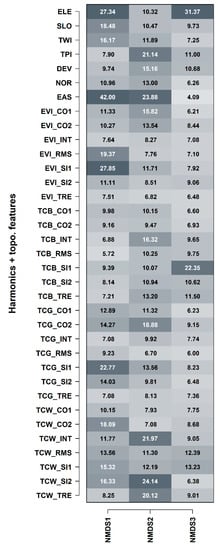Feature importance values for RF classification of forest types showed high importance of topographic variables in the top-performing harmonic and topographic pairing for both overall accuracy and accuracy at the class-level, as might be expected given the importance of this dimension in driving ecological separation of forest types in the study area and our classification system (Figure 8). Important topographic variables included transformed aspect, eastingness, and TWI. Among harmonic features, cosine and sine coefficients, describing the seasonality in TCT components and EVI, periodically emerged as top predictors at both the overall and class-level. Shared across multiple classes was the importance for these terms fitted specifically to TCW. Feature importance’s for RF regression models of NMDS ordination axes scores generally mirrored that of categorical classification of forest type (Figure 9), with transformed aspects and elevation (ELE) being particularly important. Important harmonic features included the sine terms fitted to EVI, TCW, and TCB.