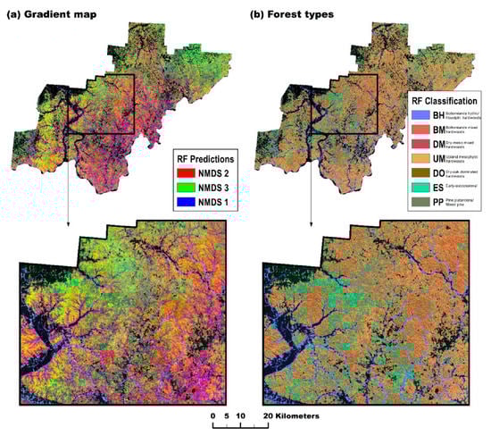 Harmonics + topographic feature set pairing maps; (a) gradient compositional response (see the color chart provided in Figure 4 for referencing a species composition across the color gradient); (b) forest type classification.