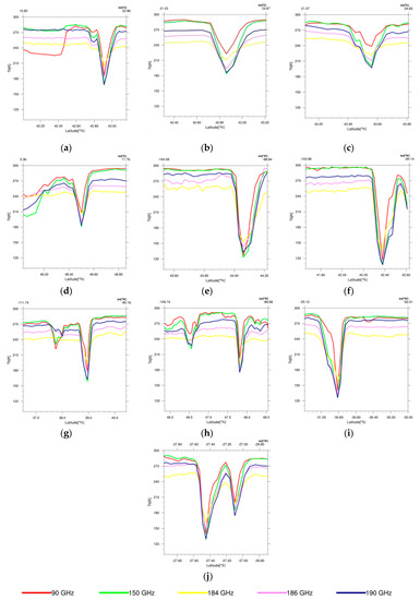 TBs at all frequencies in Figure 1 decrease when approaching the storm core showing high sensitivity to the hail scattering. The contribution by all channels is well differentiated showing different sounding capabilities with respect to the storm intensity (Figure 1a–d). In particular, the 90 GHz channel exhibits high TB with respect to the ones at 150 and 190 GHz possibly indicating low sensitivity to small hailstones. On the contrary, the same frequency triplet strongly reduces the signal when observing hailstorms over the US Great Plains and AR (Figure 1e–j).
