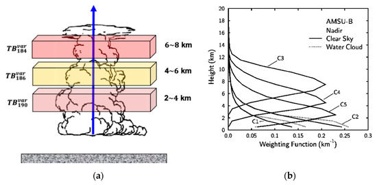 Figure 2 introduces the conceptual scheme of the MWCC. An idealized convection tower (Figure 2a) progressively grows and impacts on the MHS weighting functions (Figure 2b) as a direct effect of its development phase ([6,41]).