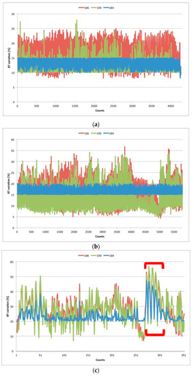 In order to better discriminate all signals associated with hail, the TB variation at 184 GHz (see Equation (1)) as distributed in the CO3 category has been analyzed. Therefore, three sensitivity classes based on the values have been defined on the basis of the simple concept that tends to increase by increasing the amount of growing ice, which is in turn related to the vertical development of convection. The magnitude of is then related to the convection depth: high values of mean high convection severity (high scattering) and then high probability of hail. Table 3 shows the average TBs for each bin.