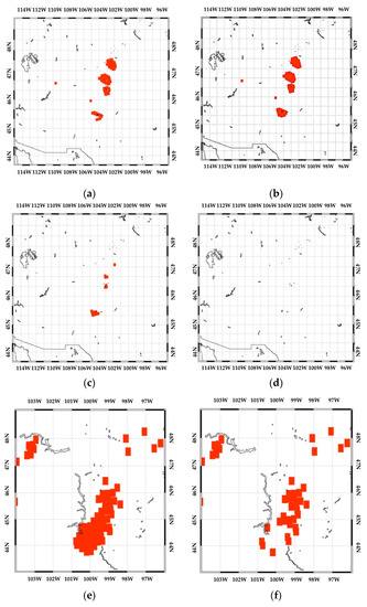 sensitivity classes applied to the hailstorms over Colorado (a–d) and South Dakota (e,f). The sequencing of CO3 complete domain (a,e) using the thresholds identifies the majority of convective pixels in the class 15%–25% (b,f) while classes with values ranging in 25–35% (c,g) and > 35% (d,h) enclose the main hail cores. Note that no pixels belong to the class > 35% for the Colorado hailstorm where the measured hail diameter at ground was lower than 3.5 cm.