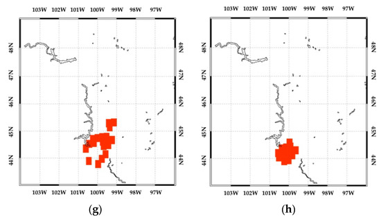 The second series of images displays the event over South Dakota (Vivian) where the measured hail size at the ground was around 11 cm. In this case, the sequencing of the whole dataset (Figure 5e) with the thresholds demonstrate as the smaller ice particles (low scattering) are collected by 15% < < 25%, (Figure 5f) but the signal associated with hail is sampled by classes > 25% (Figure 5g,h). In particular, > 35% (Figure 5h) caught the highest TB reductions correlated to the extinction by very large hail.