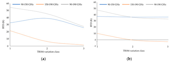 Brightness temperature differences (BTD) fitting the three classes for hail diameters 2 < d < 10 cm (a) and d > 10 cm (b). Note that the difference (BT150–BT190) shows high sensitivity in capturing hail features with changing diameters.