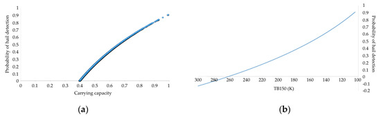 The dynamics of the hail detection model when applied to the whole dataset (2882 data) is reported in Figure 8a. The distribution of probability starts with a carrying capacity about 0.40, which roughly corresponds to TB150 > 270 K and is quite far from hail signatures as found in Table 6. Thus, for finding a numerical value that fits the hail signal, Equation (4) is adjusted on the basis of TB150 values displayed in Table 6 used as input to Figure 8b. The hail detector starts with probability values > 0. 36 (TB150 = 181.30 K) generally associated with graupels or small hail aggregates to large hail (2 < d < 10 cm) then reaches values around 0.53 when TB150 = 152.51 K, which is associated to the transition between large hail (d < 10 cm) to super hail (d > 10 cm) and finally the model stops (saturation condition) when TB150 approaches the critical value 103.70 K, i.e., the absolute minimum found in the training dataset.