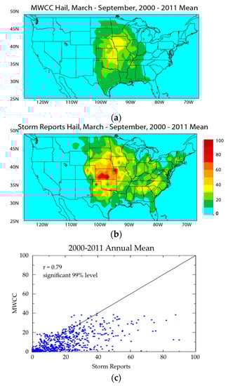 2000–2011 annual mean distribution of hail events from the (a) the MWCC hail detection model and (b) surface storm reports; (c) scatter plot of the correlation between the two datasets.