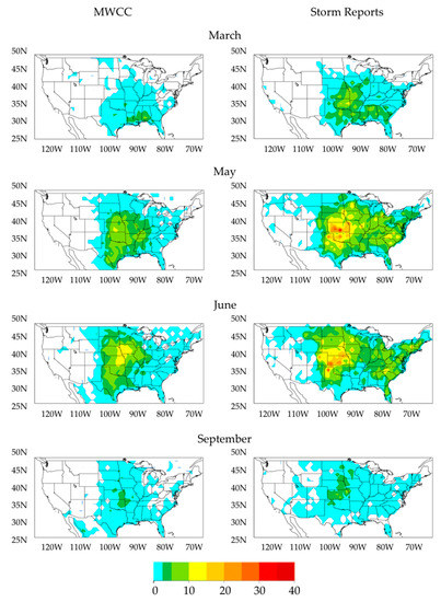 An inspection of the plates (a) and (b) in Figure 9 demonstrates the similarities between the MWCC-Hail and the SPC storm reports. The majority of hail occurrences are located in the Central US with a clear coverage of the Eastern US. Even though the MWCC-Hail tends to underestimate the number of events with a maximum number of occurrences around 40 with respect to more than 60 as reported by the storm reports, the area of maxima is well reproduced.