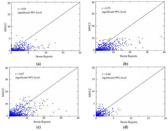 The overall performance of MWCC-Hail quantified in the scatterplot of Figure 9c confirms on one hand the underestimation with respect to hail reports while at the same time the high correlation coefficient (0.79) indicates notable retrieval capabilities.