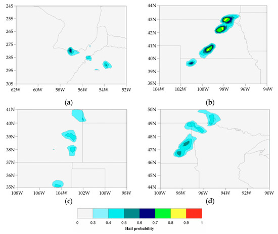 Hail probability as calculated by the MWCC-Hail for hailstorms over (a) Argentina (Colonia) 13 Nov 2017 2136 UTC, (b) South Dakota (Charles) 21 Aug 2007 2341 UTC, (c) Colorado–New Mexico 9 May 2017 0337 UTC, and (d) Minnesota–North Dakota 10 Jun 2017 0237 UTC.