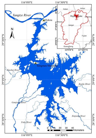Poyang Lake (115°49.7′~116°46.7′ E, 28°24′~29°46.7′ N) is located in the lower Yangtze River Basin. Tributaries of five rivers, namely the Ganjiang, Fuhe, Xinjiang, Raohe, and Xiushui rivers, feed the lake (Figure 1). Seasonal variation of precipitation leads to significant changes in the lake’s surface area throughout the year [30]. The water surface area exceeds 3,000 km2 during the wet season (April–September) and then drops below 1,000 km2 during the dry season (October–March). Poyang Lake is also one of the world’s most ecologically important wetlands, with millions of migratory birds, including about 98% of the world’s population of Siberian cranes, inhabiting the lake area for wintering.