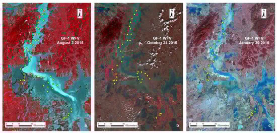 The GF-1 satellite images were downloaded through the Remote Sensing Market Service Platform of the Chinese Academy of Sciences (http://www.rscloudmart.com). The GF-1 satellite was launched on 26 April 2013. The satellite has a sun-synchronous orbit with an altitude of 645 km, crossing the equator at 10:30 local time in a descending mode. The satellite carries panchromatic (2 m resolution) and multi-spectral (8 m resolution) sensor systems for high-resolution observation and four wide-field-of-view (WFV) sensors for large-scale observation. The four WFV sensors acquire multi-spectral data with a spatial resolution of 16 m, a revisit cycle of four days, and wide coverage (4 × 200 km). Table 1 shows the spectral bands of GF-1. The predicted service life of this satellite is five to eight years. The images that were employed in this study were acquired August 3 and October 24, 2015 and January 30, 2016, respectively. The images captured the lake wetland transition between the highest and lowest water levels in summer 2015 and the follow up winter. The water level change reflected the variation of aquatic environment, in particular for concentrations of Chl-a and TSM.
