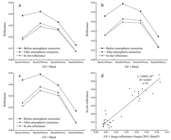Comparison of GF-1 reflectance before and after atmospheric correction with in situ measured spectra, (a): mean value of data from August 2015; (b): mean value of data from October 2015; and, (c): mean value of data from January 2016. (d) Validation between the Band-3 reflectance of GF-1 imagery and in situ measured reflectance (August 2015).