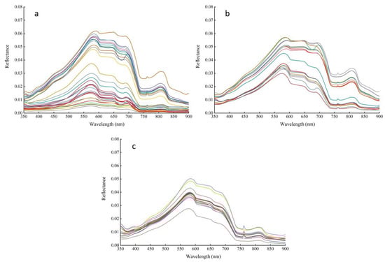From the reflectance spectra that are shown in Figure 5a, it can be concluded that almost the whole reflectance of the spectra are significantly and positively correlated with TSM concentration between 350 and 900 nm. From the reflectance spectra that are shown in Figure 5b, it can be concluded that the reflectances below 700 nm are highly sensitive to Chl-a concentration. The reflectances beyond 700 nm are almost completely insensitive to Chl-a concentration, and the reflectance after 830 nm is weak and noisy. Therefore, it can be concluded that the reflectance between 700 and 830 nm can be used for the inversion of TSM concentration.