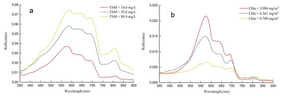 From the spectra shown in Figure 5b, it can be concluded that the reflectance between 500 and 700 nm is inversely proportional to the concentration of Chl-a, and the reflectance beyond 700 nm is basically insensitive to the concentration of Chl-a. From the spectra that are shown in Figure 5a, it can be concluded that the reflectance is proportional to the TSM concentration. The wavelength positions of the absorption valley at the wavelength of 660 ~ 680nm and the reflection peak near 700nm are very stable, and they do not change with the change of TSM concentration. Therefore, the absorption valley at 660–680 nm and the reflection peak around 700 nm can be used as characteristic bands for the inversion of Chl-a concentration.