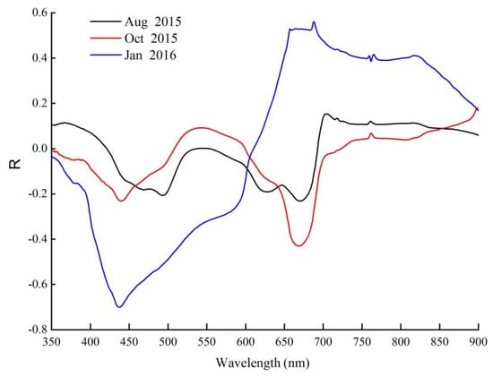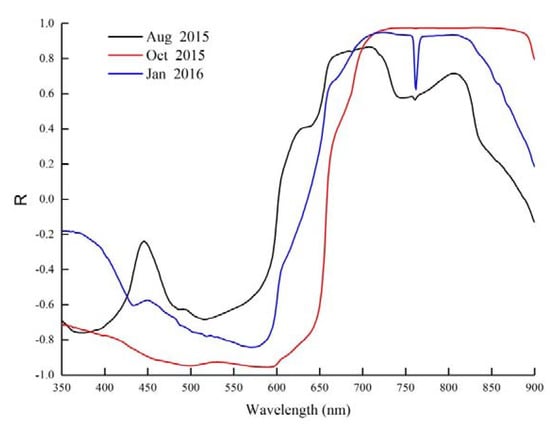 Remote-sensing-reflectance spectra were measured above the water surface at wavelengths between 350 and 2500 nm (1 nm interval) while using a Fieldspec 4 spectroradiometer (Analytical Spectral Devices, Inc., Boulder, Colorado, USA), following standard protocols [32]. Measurements were performed between 10:00 and 14:00 on sunny windless days. A total of 66 sampling sites (35 for August 2015, 17 for October 2015, and 14 for January 2016) were measured for remote-sensing-reflectance spectra due to the limitation of measurement time. The radiances from water, sky, and a reference panel were measured at each water sampling site.