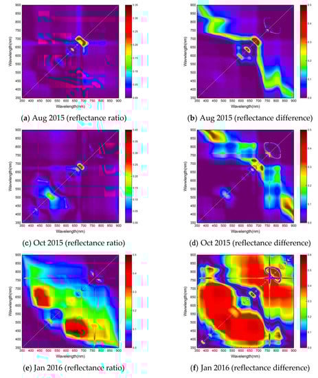 As shown in the isopotential map that was based on the original spectral data from October 2015 shown in Figure 7c, the coefficients of determination between the Chl-a concentration and ratio index in Poyang Lake are low. High coefficients of determination are observed for spectral combination of wavelengths of 680–690 and 690–700 nm, however the maximum value (R2=0.4) is still at a low level. The coefficients of determination between difference index and Chl-a concentration in Poyang Lake are higher than those between ratio index and Chl-a concentration, as shown in Figure 7d. The combinations of spectral wavelengths those are sensitive to Chl-a are 660–680 vs 720–730nm and 390–420 vs 870–900 nm.