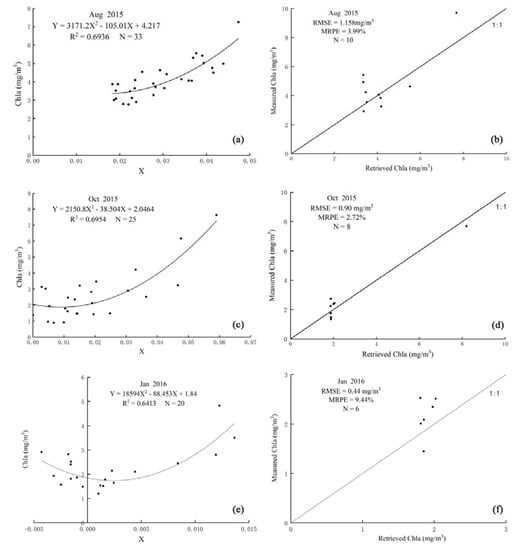A summer inversion model for Chl-a concentration was established while using 33 sets of data that were measured in August 2015 (Figure 8a). Of the various models that were assessed, the inversion model that used quadratic polynomials had the highest fitting degree (R2=0.6936); this model was subsequently validated while using 10 sets of measured data (Figure 8b). The results showed that the RMSE of the model was 1.158 mg/m3 and the MRPE was 3.99%. Additionally, an autumn inversion model for Chl-a concentration (Figure 8c) was established based on 25 sets of data measured in October 2015. Again, the model that used quadratic polynomials had the highest fitting degree (R2=0.6954). This model was validated with eight sets of measured data (Figure 8d). The results showed that the RMSE of the model was 0.90 mg/m3 and the MRPE was 2.72%. Finally, a winter inversion model for Chl-a concentration was established while using 20 sets of data measured in January 2016 (Figure 8e). The model that used quadratic polynomials had the highest fitting degree (R2=0.6413). This model was validated using six sets of measured data (Figure 8f). The results showed that the RMSE was 0.44 mg/m3 and the MRPE was 9.44%.