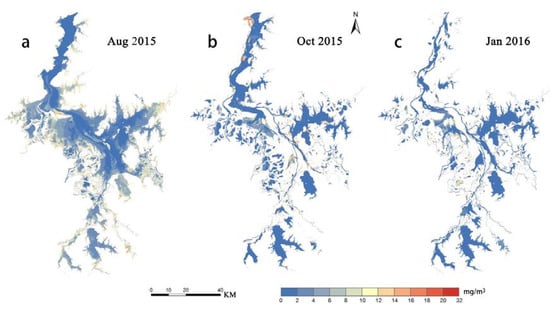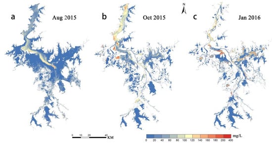 The estimated spatial distribution of TSM concentration in Poyang Lake for three periods: (a) August 2015; (b) October 2015; and, (c) January 2016.