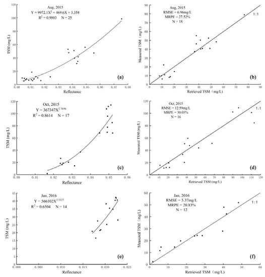 Test results for the models for the retrieval of TSM concentration for three seasons: (a,b) calibration and validation results for August 2015; (c,d) calibration and validation results for October 2015; (e,f) calibration and validation results for January 2016.