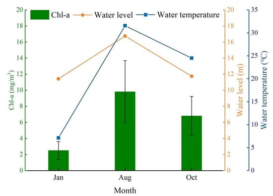 Figure 13 illustrates the water temperature data from the sampling sites in order to investigate the seasonal variation of the concentration of Chl-a in detail; the results of the inversion of the concentration of Chl-a; and the water level measured at the Xingzi hydrological station.