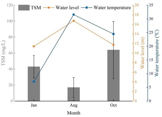 We compared the concentration of TSM calculated while using the retrieval model, the water temperature measured at the sampling sites, and the water level measured at the Xingzi hydrological station in order to investigate the seasonal variation of the TSM concentration in Poyang Lake (Figure 14).