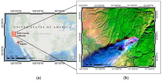 Maps of Butte County, California, United States of America, where the Camp Fire wildfire burned for 17 days, from November 8 to November 25: (a) location of Butte County in relation to the city of Los Angeles and (b) image of Butte County from Sentinel-2 data acquired on November 11, 2018.