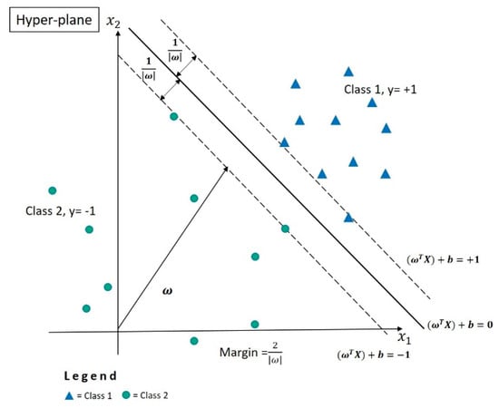 The most significant margin for the optimal linear classifier (hyperplane), modified from Deng et al. [].