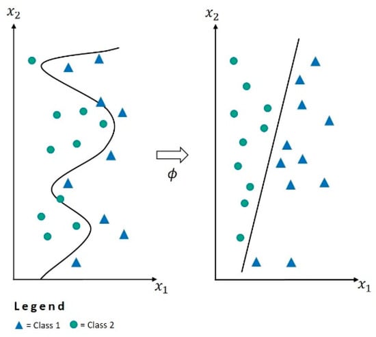 Changing a nonlinear separation to a linear separation in feature space, modified from Deng et al. [].