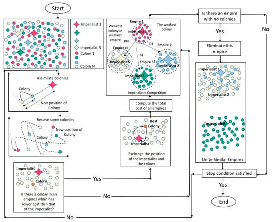 - Atashpaz-Gargari, E.; Lucas, C. Imperialist competitive algorithm: An algorithm for optimization inspired by imperialistic competition. In Proceedings of the 2007 IEEE Congress on Evolutionary Computation, CEC Singapore, Singapore, 25–28 September 2007; pp. 4661–4667. [Google Scholar]