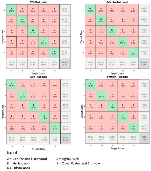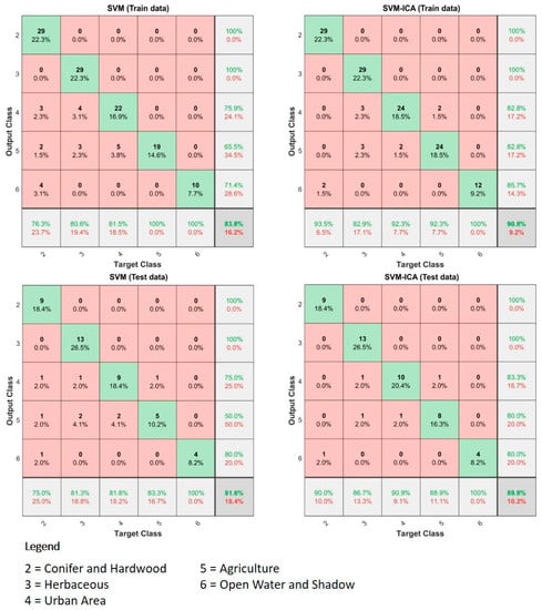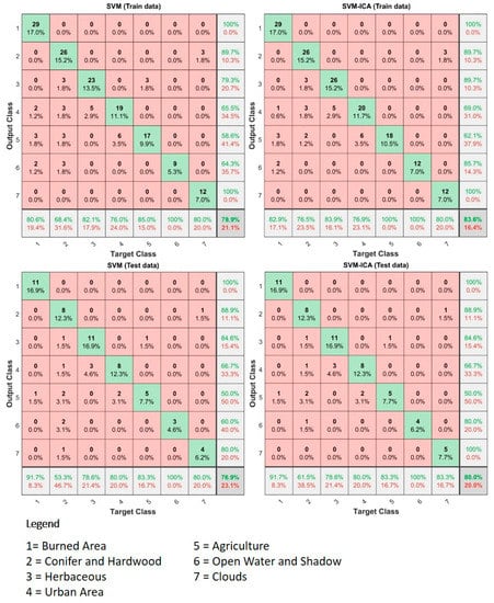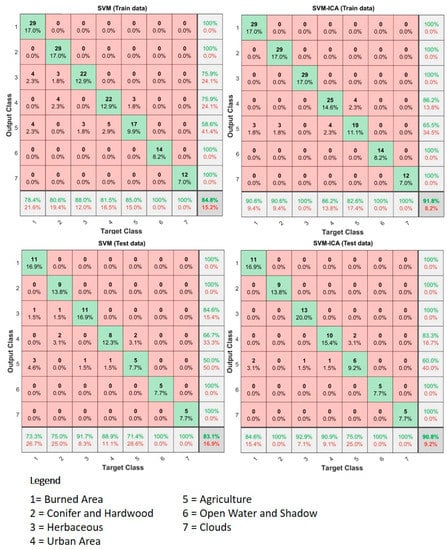 After the training data had been used to classify the Landsat-8 pre- and post-wildfire events, the accuracy of the assessment was measured. Test data (65 pixels) were used to generate the accuracies of SVM and SVM–ICA. The assessment was performed on a pixel-by-pixel basis using the error matrices method. The test data were acquired using the stratified random sampling method for both Landsat and Sentinel data, as suggested by Kadavi and Lee [] and Topaloğlu et al. []. The overall accuracy and Cohen’s kappa coefficient [,,] were acquired from the error matrix of each map, as shown in Figure 8 for the pre-wildfire results and Figure 9 for the post-wildfire results.
