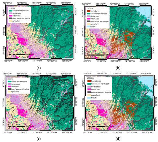 Classification results from the Sentinel-2 imagery of the Camp Fire wildfire using SVM classifier for (a) pre-wildfire occurrence, (b) post-wildfire occurrence, and using the SVM–ICA for (c) pre-wildfire occurrence, and (d) post-wildfire occurrence. The pre- and post-wildfire data were acquired on November 6, 2018 and December 31, 2018.