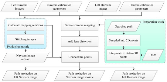 Figure 2 is the flowchart of the back-projection processes on three different kinds of images. Generally, first the searched path is sampled into 2D points according to the path-searching result, and their corresponding elevation values are obtained by interpolation from the DEM generated from the Navcam images. Then the mapping relationships between the three and two-dimensional information are established based on the camera models of both Navcam and Hazcam. Finally, the 3D information of the searched path is mapped and back-projected on multi-source 2D images to support expert decisions. Processes of back projecting on different images are not the same, therefore the rest of the sub-section will introduce each procedure separately.
