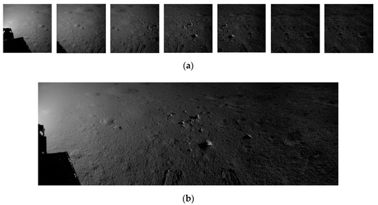 Original Navcam images and mosaic at waypoint LE00302. (a) A sequence of original images captured by the left Navcam; (b) the resultant image mosaic.