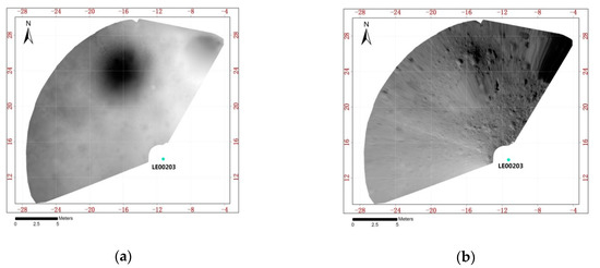 Automatically generated DEM (a) and DOM (b) from Navcam stereo images at waypoint LE00203.