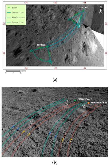 The 2nd planned path and comparison of the two paths: (a) The 2nd planned path at waypoint LE00207; (b) a zoomed-in view of comparisons of two paths at waypoint LE00207 projected on the Navcam image mosaic.