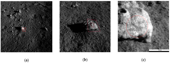 According to the mounting and calibration parameters of Navcam, Hazcam, and VNIS, the rigid transformation relations, including rotation and translation from one to another, can be calculated. Therefore, the FOV areas of both VNIR and SWIR can be projected on the Navcam and Hazcam images to provide guidance for the rover movement. Figure 12 shows the process of approaching a target at the beginning of the 3rd lunar day since Yutu-2 started its work. The rover was awaked at waypoint LE00301 where the rock can be observed by Navcam. By a short movement to arrive LE00302, the imaging area of VNIS on Navcam image captured at this waypoint was predicted as shown in Figure 12a, in which the deformed rectangle represents the FOV of VNIR and the deformed circle represents the FOV of SWIR. It can be seen that the SWIR imaging area was only partial on the target. Therefore, by the support of these information, the rover adjusted its position and gesture, and moved to waypoint LE00303. The imaging area of VNIS was predicted again on Hazcam image as this time the target is closer (shown in Figure 12b). Under the guidance of the prediction, the rover completed the target approaching task. The acquired VNIR image is shown in Figure 12c with FOV of SWIR marked as a red circle. The actual captured image indicates that the science target approaching task guided by imaging area prediction was implemented successfully. The VNIR and SWIR data of the rock and other science targets have contributed significantly to mineralogical study, surface composition research and other fields on the lunar far side [29].