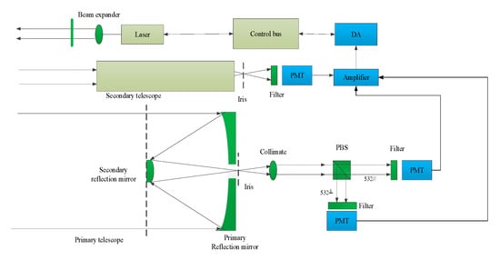 The system framework of the proposed dual-FOV lidar is shown in Figure 1. A homemade laser source provided a center wavelength of 532 nm and a fluctuation of ±0.3 nm. The single-pulse energy was 400 μJ. The repetition rate was 2–7 kHz. The linear-polarized laser beam has a divergence of 0.1 mrad collimated by a 10-times beam expander and shot into the air. The laser source with a green wavelength of 532 nm and a higher single-pulse energy from sophisticated commercial lasers was chosen to produce a higher signal-to-noise of observations and a less error of the extinction coefficients of aerosol.