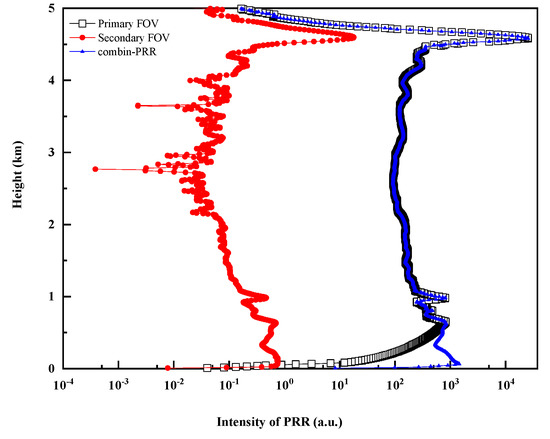 Intensities of combined PRR signal (blue triangle line), primary FOV PRR signal (black square line), and secondary FOV PRR signal (red dot line) of dual-FOV lidar.