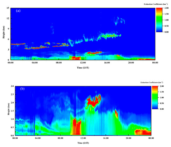 The vertical observation of aerosols with this dual-FOV lidar was performed on 14 April 2019, at Wuxi, Jiangsu, China. In the data analysis, the time coordinate used was local standard time (LST), which equates to coordinated universal time (UTC) +8 h. The lidar was set on the roof of an office building, which was approximately 30 m above ground level. A typical diurnal variation of the aerosol extinction coefficients is shown in Figure 8a. Aerosols were mainly distributed below 2 km in the early morning and night. The maximum extinction coefficient was close to 2 km−1 and was observed after 22:00. During the daytime, the atmospheric boundary layer (ABL) increased from 1 km at 8:00 to 2.3 km at 13:00, and the ABL decreased to 800 m at 20:00. From 7:00. Transporting aerosol layers at 1.5~2.5 km were also detected, and these layers mixed with the boundary layer at noon, which increased the extinction coefficient to 1 km−1. The maximum extinction coefficient reached 1.5 km−1 at approximately 11:00. These tiny structures of aerosol distribution below 3 km are shown in Figure 8b. Cloud layers appeared from dawn to 18:00, with a spread range of 3~5 km, and the extinction coefficients are larger than 5 km−1. Then, the extinction coefficients of clouds at noon decreased to approximately 2 km−1. High-altitude clouds were also observed at 19:00 at 12 km. The depolarization observation from this lidar system is shown in Figure 8c. The depolarization ratio is significant to identify the aerosol types that include haze, dust, smoke, volcanic emissions, and particles released through pollution (e.g., carbon-based) or by the surface of the ocean, and those created by gas-to-particle conversions [14]. The aerosol distribution below 2.5 km had a depolarization ratio less than 0.15 mainly dominated by fine particles, and a depolarization ratio of more than 0.6 referred to the cloud distributions at 3~5 km and 12 km.