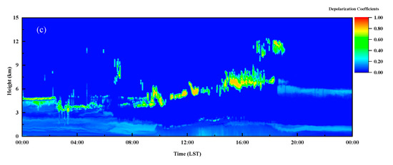 Vertical profile of aerosol detected by dual-FOV lidar. (a) Aerosol extinction coefficients in 15 km. (b) Aerosol extinction coefficients in 3 km. (c) The depolarization coefficients at 532 nm on 14 April 2019.
