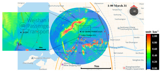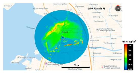 One sample of aerosol distribution scanning on the early morning of 31 March is shown in Figure 9. It is noted that the aerosols were steadily suspended in the range of 2 km to the southwest, south and southeast of the LS. These areas are occupied by many large steel and iron factories and chemical plants. These pollution sources strongly contribute to the ρ(PM) at the AQS with a southeast wind direction. In Figure 9, a pollution mass with an approximate length of 5 km was observed 2~2.5 km north of the LS. The right-wing of this belt significantly influenced the ρ(PM) at the AQS. The corresponding ρ(PM10) increased to 135 μg/m3 (Figure 10). The overhead extinction coefficient from the lidar system was 0.53 km−1. This pollution mass led to air quality deterioration at AQS in the next few hours.