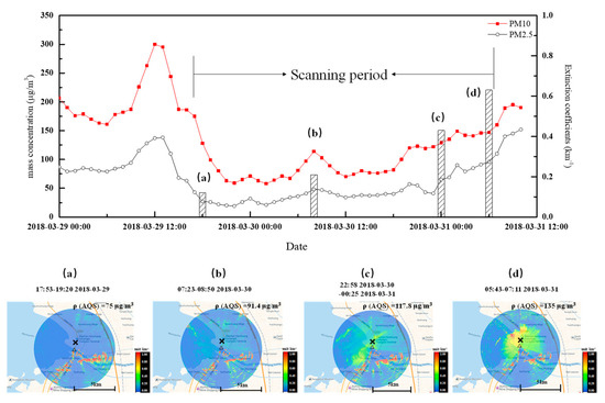 Lidar scanning began at 17:53, 29 March and ended at 07:11, 31 March 2018. In total, 30 cycle-scanning maps were acquired from this field experiment. Time series of ρ(PM) at the AQS and four lidar scanning results of aerosol distribution are shown in Figure 10. ρ(PM10) and ρ(PM2.5) decreased from 128 μg/m3, and 27 μg/m3, respectively, at the beginning of the observation (upper panel of Figure 10). The corresponding lidar scanning illustrated few particulate matters around the AQS, and the overhead extinction coefficient of the AQS was 0.12 km−1 (lower panel Figure 10a). The ρ(PM10) and ρ(PM2.5) climbed up to 114 μg/m3 and 47.4 μg/m3 at 08:00, 30 March (upper panel of Figure 10). The lidar observation at 07:23–08:50 confirmed the accumulation of aerosols over the AQS, with an overhead extinction coefficient of 0.21 km−1 (lower panel Figure 10b). From 23:00, 30 March, the ρ(PM10) and ρ(PM2.5) climbed steadily from 122 μg/m3 and 41 μg/m3 to 160 μg/m3, and 109 μg/m3, respectively, at 07:00, 31 March, the end of lidar scanning (upper panel of Figure 10). At this stage, the lidar maps show that the aerosols were enriched toward the AQS and increased the PM mass concentrations. The corresponding overhead extinction coefficients were 0.43 km−1 at 23:00, 30 March and 0.63 km−1 at 06:00, 31 March (lower panel Figure 10c,d).