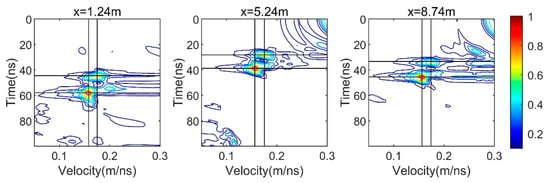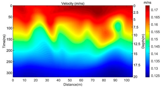 In Figure 15, the error ranges of velocity and two-way reflected time are 0.161–0.179 m/ns and 55.8–56.84 ns, respectively. So, the real velocity and time may be within these two ranges. A maximum relative error (MRE) can be adopted to quantitatively describe the error: