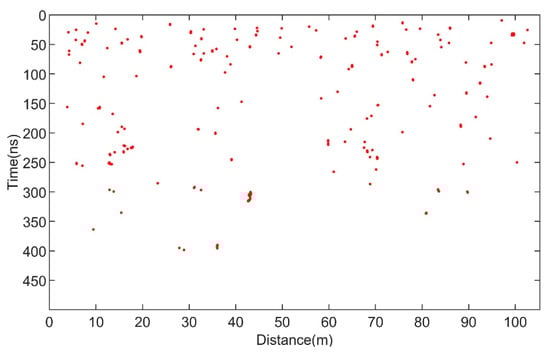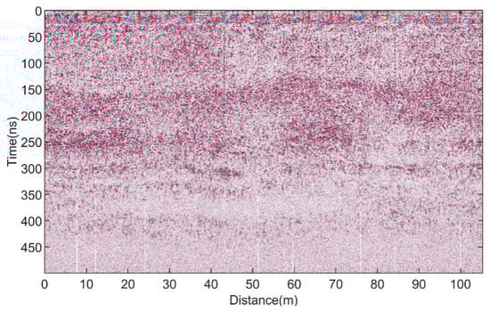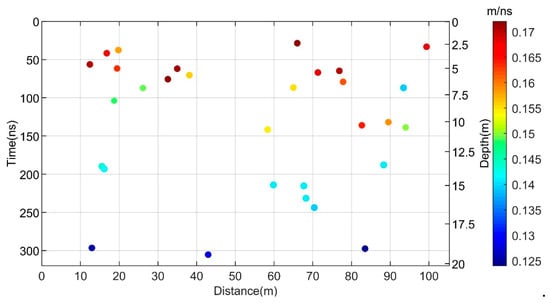 In Figure 10, the points with different velocities distribute in different layers: 0.15 m/ns seem to be a watershed; the points whose velocities are bigger than 0.15 m/ns are mainly distributed in 0–150 ns zone; the points whose velocities are smaller than 0.15 m/ns are mainly distributed in 150–320 ns zone; this indicates the clear property difference between these two parts which can also be seen from Figure 11, Figure 12, Figure 13 and Figure 14. These phenomena also correspond to the characteristic of radargram that 0–150 ns zone is of high weathering degree with few rock reflections and 150–320 ns zone is of low weathering degree with strong reflections.