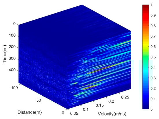 Based on (1)–(3), the 3D velocity spectrum is computed; the range of values are limited to 0 to 1; the 3D result without compensation of 1/Ni is shown in Figure 5.