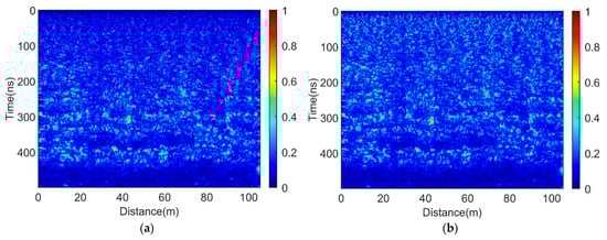 In order to locate the positions of hyperbolas on GPR profile, the maximum values Ci,j along velocity axis are also figured out, which is shown in Figure 6a. Subsequently, 1/Ni is adopted to compensate the energy differences caused by using different windows Ni along longitudinal direction, the result is shown in Figure 6b. The result shows the energies in shallow regions are compensated.