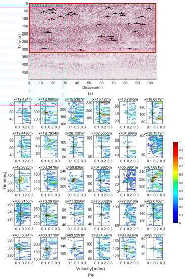 Result of hyperbola selection. (a) Hyperbolas on radargram; (b) velocity spectrum slices of 30 hyperbolas—the black crossed lines indicate the positions of maximum values.